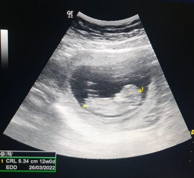 Two months following the procedure, the patient came with positive home pregnancy test. Ultrasound examination show a gestational sac with mean sac diameter 16 mm.Two months later, the pregnancyshowed a positive fetal node and heart beat(Figure 3). Antenatal care was scheduled asroutine care for pregnancy.