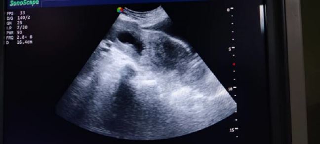 Fig. 4 B third case described: Saline Infused Sonography (SIS) Abdominal US with filled bladder. The uterine cavity is clearly seen at the right-hand side of the picture with in the lower part of the image the pregnancy extending towards the bladder no residual tissue can be made out between bladder and CSP (Type 2 CSP).