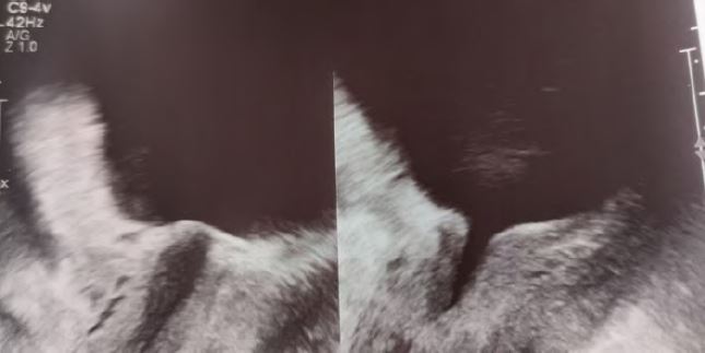 It is also possible to observe the longitudinal movement of the pelvic floor. Especially dorsal, this indicates a high risk of recurrence for posterior defects. On the one hand, the stability of the pelvic floor muscles can be palpated well, especially the ability of the patient to actively control the muscles is very easy to check with palpation, but ultrasound can also visualize the concentric work of the muscles very well. This helps, above all, the patient to observe the activity of the muscles herself. This works very well with a normal vaginal probe. With ultrasound, an avulsion (rupture of the levator muscle) can be well excluded or confirmed (Pic.:2).