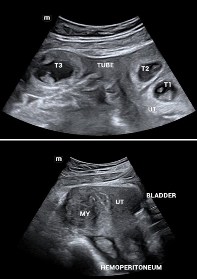 Figure 1: Ultrasound findings: A shows three gestational sacs, two of which are intrauterine (UT) twins (T1, T2) and one in the right tube (T3). B shows a sagittal section of the pelvis. A posterofundal fibroid (MY) and an effusion in the Douglas suggesting hemoperitoneum were noted