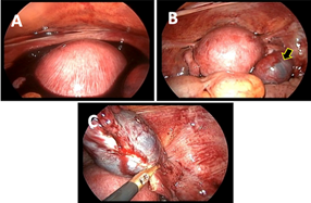 Figure 2: A shows the hemato-peritoneum; B shows the pregnant uterus and the ruptured tubal pregnancy; C shows the salpingectomy