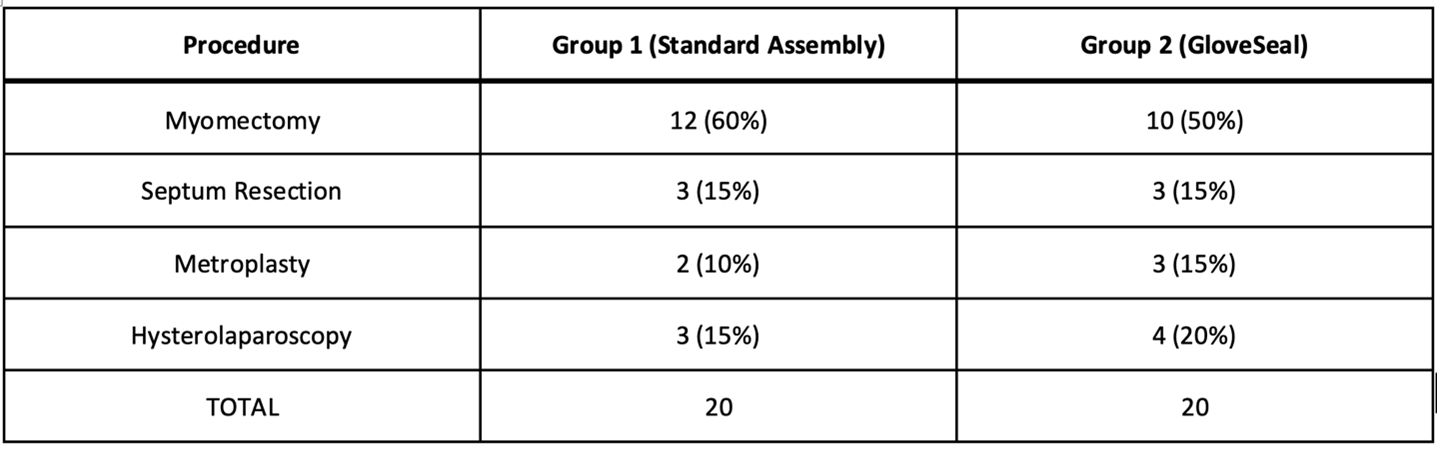 All patients included in the study, divided in the standard assembly group (group 1: n = 20) and the GloveSeal group (group 2: n = 20) were analyzed. The procedures performed across both groups were 22 hysteroscopic myomectomies (55%), six hysteroscopic septum resections (15%), five hysteroscopic metroplasties (12.5%) and seven diagnostic hystero laparoscopy procedures (17.5%). They were divided similarly in both groups, being myomectomy in 12 (60%) and ten (50%) cases, septum resection in three (15%) and three (15%) cases, metroplasty in two (10%) and three (15%) cases and hystero laparoscopy procedure in three (15%) and four (20%) cases respectively.