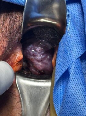 The case of a 40-year-old woman, Gravida 4, Para 3, with a 17.2-week pregnancy, under follow-up for a cervical tumor is reported. No significant pathological, surgical, nor obstetric personal history. She presented to the emergency department due to abundant transvaginal bleeding, accompanied by clinical signs of hypovolemia. On physical examination, active bleeding from the cervical mass was confirmed (Figure 1). Given the magnitude of the bleeding and her hemodynamic condition, an urgent surgical intervention was decided for selective vascular control.