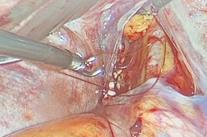 During the exploration, the right hypogastric artery was identified, locating its anterior division. Ligature was performed with 4-0 chromic suture, with no intraoperative incidents or associated injuries (Figure 3). The total estimated blood loss was 50 ml. Prior to the procedure, the fetal heart rate was 130 beats per minute; at the end, it was recorded at 140 beats per minute. The patient was transferred to the recovery area with stable vital signs, no active bleeding, and adequate peripheral perfusion.