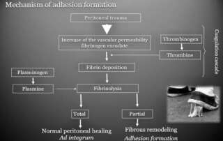 Adhesions after pelvic infection (left) and adhesions after laparoscopic hernia mesh repair (right)